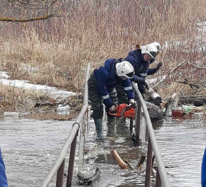 Проводя круглосуточный мониторинг, спасатели на пешеходном мосту через реку обнаружили затор: скопление бревен, мусора и веток. Они оперативно начали его расчищать.