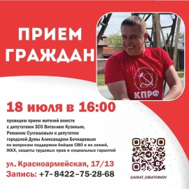 Сенатор РФ Айрат Гибатдинов сообщает, что 18 июля в 16:00 проведет в Ульяновске прием населения. Он будет проходить в областном комитете КПРФ по адресу: улица Красноармейская 17/13.