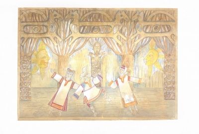 — Среди предметов, связанных с изображением масленичных традиций, выделяются эскизы декораций к балету А.Н. Островского «Снегурочка» на музыку П.И. Чайковского. В постановке есть сцена, которая называется «Проводы Масленицы». Премьера балета прошла в 2007 году в Государственном академическом театре Н.И. Сац. Эти эскизы принадлежат кисти известной художницы Ксении Шимановской. Ксения Володаровна много работала и работает с театрами, она — Заслуженный художник России. Эскизы выполнены на бумаге, для создания художница использовала белила, акварель и цветные карандаши. Любопытно, что эти эскизы еще не выставлялись для широкой аудитории. Выставочный дебют у них впереди, — рассказывает заведующая сектором учета и хранения Фондов Музея-заповедника «Родина В.И. Ленина» Елена Пайсина.