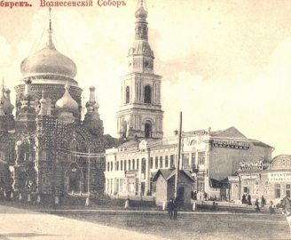 Главное фото: Спасо-Вознесенский собор на дореволюционной открытке. Видно, что храм значительно выступает за красную линию улицы Гончарова, по сравнению с существующими до сих пор домами