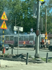 Трамвай при этом стоит и от него в небо поднимается сильный дым.