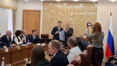 На девятом заседании ульяновской Гордумы спикер Илья Ножечкин получил тельняшку, которая побывала в космосе. Этот предмет станет новым экспонатом в музейной коллекции думы. Тельняшку вручал Герой России Олег Лобунец.