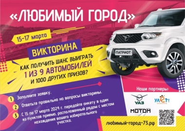 Участвуйте и получите шанс стать обладателем одного из девяти автомобилей марки УАЗ или 1000 других подарков. Для участия нужно получить буклет викторины у представителя организатора, правильно ответить на вопросы и передать волонтерам заполненный буклет в период с 15 по 17 марта рядом с местом нахождения вашего избирательного участка.