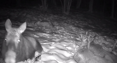 — Наши фотоловушки запечатлели мирную картину: компания лосей, отдыхающих после плотного ужина. Кадры, наполненные спокойствием дикой природы, — говорится в сообщении.