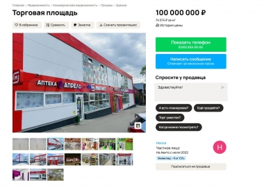 На площадке бесплатных объявлений «Авито» появилось предложение о покупке торгового центра на улице Маяковского, 29. Объект общей площадью 1350 «квадратов» продается за 100 миллионов рублей (74074 рубля за 1 кв. м).