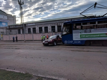 Сегодня днем на улице Тимирязева рядом со стадион «Симбирск» произошло ДТП. Водитель автомобиля ВАЗ-2112 решил развернуться перед трамваем, и тот в него врезался.