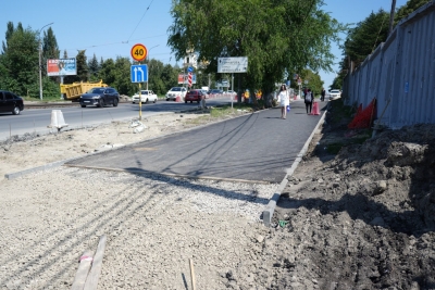 От пересечения улицы Минаева с улицей Куйбышева и далее до малой кольцевой развязки строят тротуар. Здесь уже установили борткамень, подготовили щебёночную основу и начали укладывать асфальт. Эта пешеходная зона будет постоянной взамен временных тротуаров.