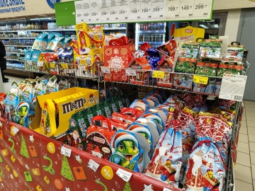 В «Маните» несколько отдельных стеллажей отведены под бренды: M&M's («Камин» — 469,99 руб/ 394 г; «Посылка» — 179,99 руб./ 150 г; «Колокольчик» — 279,99 руб./ 168 г; «Имбирный дом» — 299,99 руб./ 215 г); Milka (Party mix — 399,99 руб./ 373 г; «Портфель» — 419,99 руб./ 398 г). Из доступных — нам попался набор за 99,99 руб/ 150 г. Остальные цены на фото.