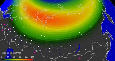 Есть шанс увидеть северное сияние. На данный момент, полярные сияния обладают умеренной яркостью, но прогнозируется их дальнейший рост в течение недели. Текущие показатели являются самыми высокими с начала сентября. В связи с этим, рекомендуется сегодня наблюдать за северной частью неба.