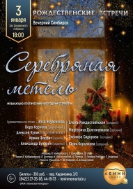 3 января в 18:00 в зале Дворянского собрания (пер. Карамзина, 3/2) «Рождественские встречи» продолжит концертная программа «Серебряная метель» - музыкально-поэтический новогодний серпантин из романсов, песен и стихов русских и советских авторов.