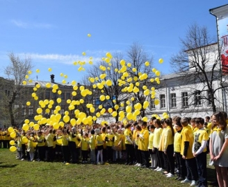 Традиционная массовая акция прошла возле стен одного из старейших образовательных учреждений города. Дети в жёлтых футболках выстроились в форме солнца и в унисон спели легендарную композицию.