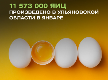 В январе этого года птицефабриками Ульяновской области произведено 11 573 тысяч штук куриных яиц – это на 18,4% больше уровня прошлого года.
