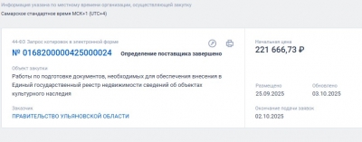 Заказчиком работ выступило Правительство Ульяновской области. Согласно контракту, изначально на работы из бюджета казенных учреждений и органов власти на 2025 год выделялась ₽221,6 тыс., однако на электронный аукцион заявился участник, предложивший свои услуги за ₽90 тыс. — он и стал победителем, данные пока не раскрываются.