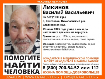 Как сообщалось ранее, в Ульяновской области вчера пропал 86-летний житель деревни Кочетовка Василий Ликинов. Его местонахождение неизвестно.