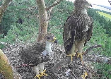 В апреле Арбушка снесла первое яйцо, а потом еще два. Из всех трёх яиц вылупились птенчики, но 22 июня один из них умер. Два других орлёнка подросли, и им предложили придумать имена.