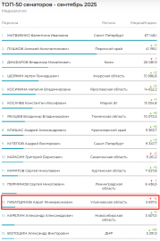 По итогам парламентской работы сенатор Совета Федерации от Ульяновской области Айрат Гибатдинов с медиаиндексом 5837,5 занял 13 строчку из 50, спустившись вниз на 4 позиции — в августе он занимал 9 место, тогда индекс составлял 8853,2.