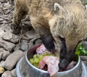 Свое название носуха получила из-за своеобразного подвижного носа, напоминающего хобот. На видео заметно, как увлеченно питомец занят завтраком – придерживает кусок свежей курятины лапкой и пытается откусить. Кроме мяса в миске виноград и петрушка.