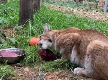 В воскресенье на завтрак рыси Севе предложили приличный кусок говядины – любимое лакомство хищника. Сева растягивает удовольствие. После мяса рысь примется за тыкву, которую ей приготовили сотрудники зоопарка.