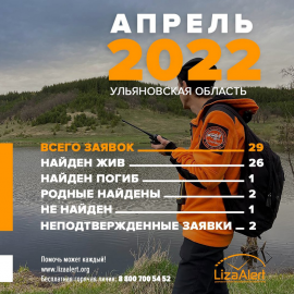 Поисковый отряд «ЛизаАлерт» опубликовал статистику за апрель. Всего поступило 29 заявок на поиски 32 человек – 21 мужчины и 11 женщин.