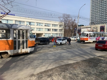Так, ДТП произошло напротив гимназии №1. Сейчас там собралась колонна из трамваев, которые ехали в сторону улицы Ленина.
