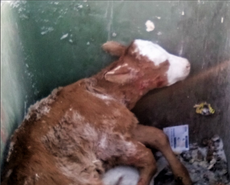 Сегодня утром, 20 янаря в райцентре Чердаклы Ульяновской области экипаж мусоровоза обнаружил в контейнере для отходов мертвого теленка. Факт был зафиксирован на улице Пионерской, 2-а.