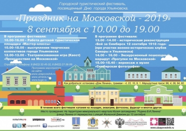 Праздновать День города ульяновцы будут 8 сентября. В этот день на улице Ленина (бывшей Московской) состоится городской туристический фестиваль «Праздник на Московской-2019». Администрация Ульяновска и музей-заповедник «Родина В.И.Ленина» организуют это событие впервые.