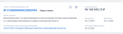На портале ЕИС «Закупки» началась подача заявок на проектирование и реконструкцию системы водоснабжения рабочем поселке Николаевка Николаевского района. Подать заявку на участие в конкурсе можно до 3 декабря.
