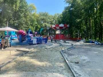 В парке «Молодежный» продолжаются работы по благоустройству территории. В настоящее время специалисты занимаются укладкой новой дорожки по старому асфальтовому покрытию на участке между аттракционами «Вальс» и «Весёлые горки».