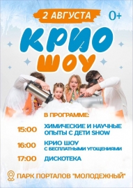 2 августа дети смогут нахимичить на шоу «Занимательная наука» от команды «ДетиShow». Гостей парка ждут удивительные эксперименты и неожиданные открытия. Также в программе – крио-шоу: холод, пар, спецэффекты и немного сладостей в финале.