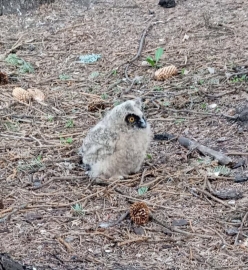 Предположительно, птенец выпал из гнезда. Очевидцы сообщают, что он сидит один под деревом. Совиха наблюдает сверху.