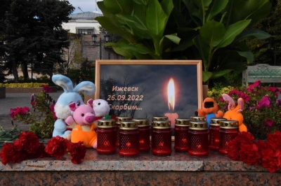 Накануне в Ижевске произошла страшная трагедия — в школе №88 неизвестный расстрелял охрану и детей. Погибли 17 человек. В память о них ульяновские волонтёры организовали в сквере Гончарова мемориал.
