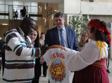 Затем гости прибыли в университет, где их хлебом-солью, народными песнями и танцами встретили творческие студенческие коллективы.