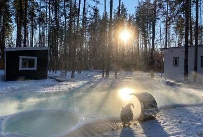 Еще один плюс «Термы.ЛES» — это уединение. Вряд ли вам придется стоять в очереди, чтобы посидеть в джакузи. Сам комплекс огорожен забором и лесом, а из бассейна открывается вид на прекрасный закат. Если вы хотите отдохнуть от звуков города и просто побыть в тишине, то это место точно подойдет для этого. Возможно, это связано с тем, что комплекс еще не успел стать популярным, но очень надеемся, что он не превратится в «проходной двор» и владельцам удастся сохранить атмосферу спокойствия и релакса.