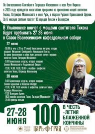 27-28 июня в Ульяновске, в Спасо-Вознесенском кафедральном соборе, будет находиться ковчег с мощами святителя Тихона, Патриарха Московского. По благословению Святейшего Патриарха Московского и всея Руси Кирилла, в 2025 году совершается принесение ковчега с мощами святителя Тихона в епархии Русской Православной Церкви в честь столетия блаженной кончины святого.