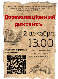 Ульяновцев приглашают написать Дореволюционный диктант, который пройдет 2 декабря во Дворце книги в рамках Декады Отечественной истории. Он начнется в 13.00 в библиотеке по адресу: переулок Карамзина 3/2.