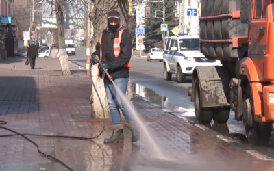 МБУ «Дорремстрой» моет тротуары с антисептиком на улицах Карла Маркса и Кузнецова.