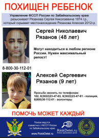 Управление Федеральной службы судебных приставов России по Забайкальскому краю разыскивает девятилетнего Алексея Рязанова, которого похитил 48-летний Сергей Рязанов. Местонахождение ребенка неизвестно.
