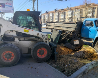 - Пни измельчаем при помощи фрезы-насадки на трактор Бобкат. Если старые она удаляет достаточно быстро, то свежие, от тополей, диаметром до метра за рабочий день убираем до четырёх штук, – рассказал директор учреждения Геннадий Моргунов.