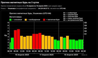 Ранее специалисты сообщили, что пик магнитной бури придется на первую половину дня 16 апреля. Магнитная буря может достигнуть уровня G2 (средняя буря).