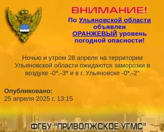 Ночью и утром 28 апреля на территории Ульяновской области ожидаются заморозки в воздухе - 0°- -3°С.
