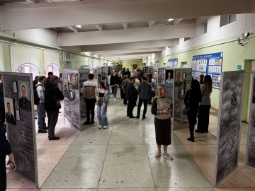 Сенатор РФ Айрат Гибатдинов вместе с участником СВО, депутатом УГД Антоном Шиловым, депутатом ЗСО Романом Султашовым и секретарем областного Комитета КПРФ Рамилем Хакимовым поприветствовали студентов, преподавателей, родственников Героев и организаторов выставки.