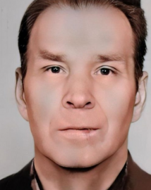 Одежда: серое пальто, тёмно-синие спортивные штаны, чёрные ботинки, коричневая шапка.