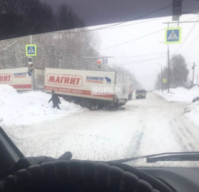 Очевидцы в соцсетях сообщают, что сегодня, 10 февраля, в северной части Ульяновска фура, которая доставляет продукты в магазины «Магнит», застряла в сугробе, парализовав движение.