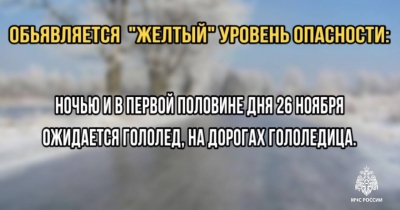 — Объявляется «желтый» уровень опасности :ночью и в первой половине дня 26 ноября местами ожидается гололед, на дорогах гололедица, — сообщили в ведомстве.