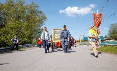 Перед началом крестного хода его участники, жители поселка и прибывшие паломники помолились в храме в честь иконы Божией Матери «Взыскание погибших» за Божественной литургией.