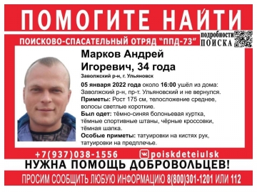 Волонтеры сообщают о пропаже жителя Заволжского района Ульяновска Андрея Игоревича Маркова.