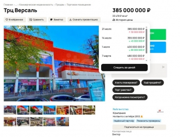 Объявление о продаже торгово-развлекательного центра «Версаль» на площадке «Авито» появилось еще в феврале этого года — тогда он стоил 440 млн рублей. За четыре месяца цена «прыгала» несколько раз, остановившись вчера на 385 млн рублей.