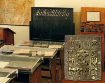 Выставка дополнена предметами из школы Арского: иконы, книги, прописи, детские рисунки и поделки.