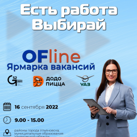 Во всех районах Ульяновска 16 сентября с 9:00 до 15:00 будет проходить ярмарка вакансий. Также площадки от работодателей и социальных партнеров службы занятости будут работать в муниципальных образованиях региона.