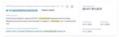 На портале ЕИС «Закупки» началась подача заявок на электронный аукцион по капитальному ремонту здания Ульяновского авиационного колледжа на проспекте Созидателей, 13Б за ₽86,6 миллионов.